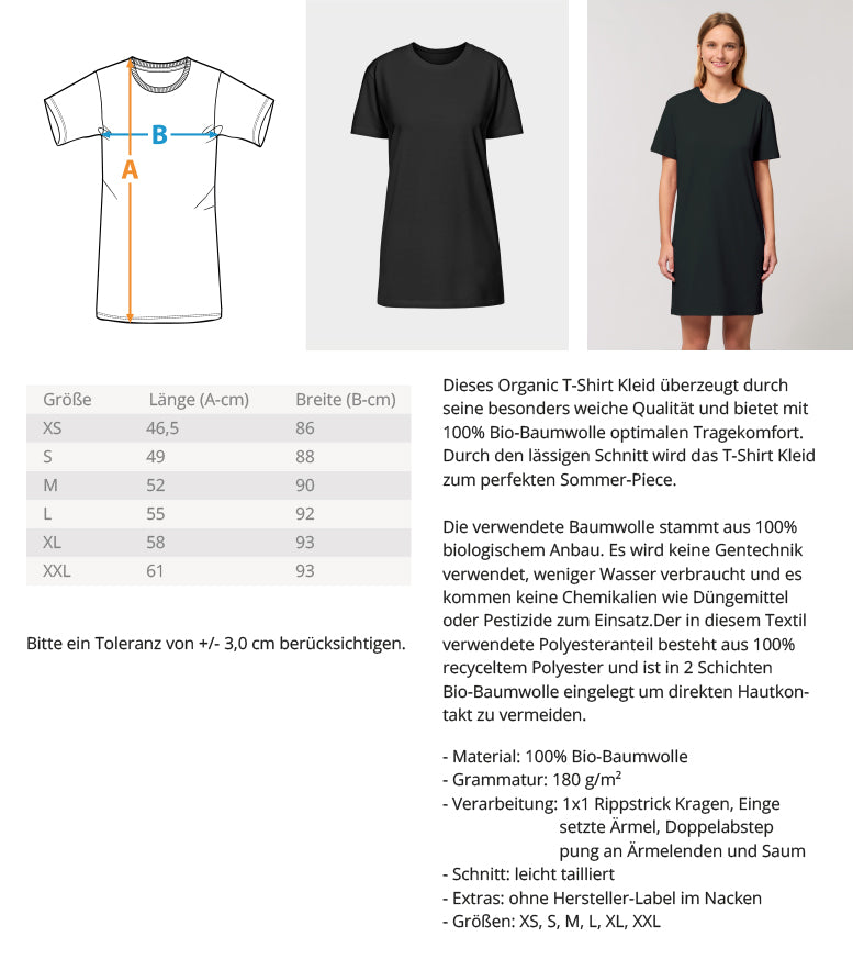 Unser hochwertiges Bio-T-Shirt-Kleid für Damen begeistert nicht nur durch seine unglaublich weiche Qualität, sondern bietet durch seine 100% Bio-Baumwolle auch optimalen Tragekomfort. Dieses Kleidungsstück ist nicht nur gut für Sie, sondern auch für die Umwelt, da es aus nachhaltigen Materialien hergestellt ist.