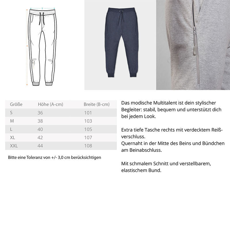 - Besonderheiten: Extra tiefe Tasche rechts mit verdecktem Reißverschluss, Quernaht in der Mitte des Beins, Bündchen am Beinabschluss.