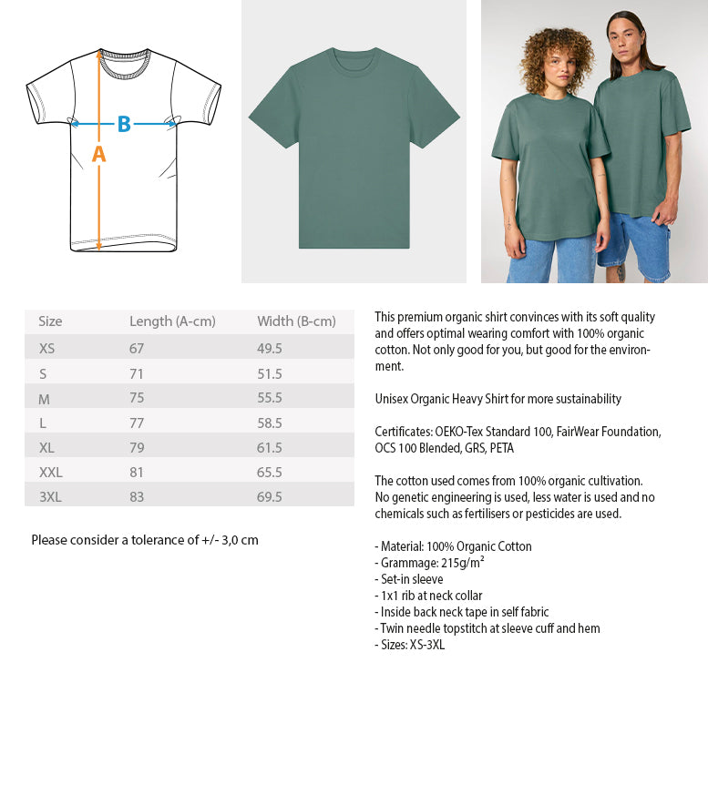 Ob als stylisches Streetwear-Basic oder als Geschenk: Mit diesem Unisex Shirt aus nachhaltiger Baumwolle liegst du immer richtig. Die schwere Qualität (215 g/m²) sorgt für ein hochwertiges Tragegefühl, während der lockere Schnitt maximale Bewegungsfreiheit bietet. Frei von Gentechnik, Chemikalien und Pestiziden – dafür mit einem klaren Statement für faire und umweltfreundliche Mode.