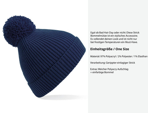 - Design: Gerippter, einlagiger Strick mit weichem Polyacryl-Aufschlag und einfarbiger Bommel